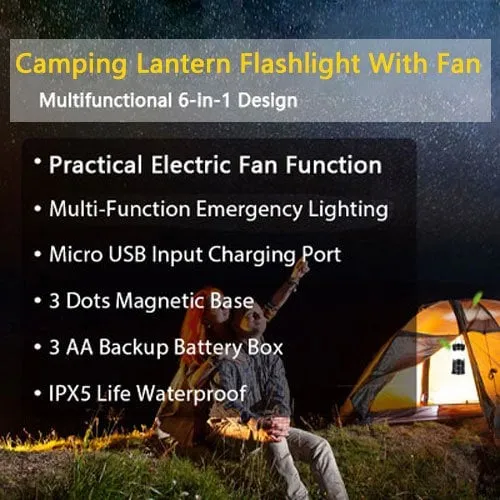 MULTIFUNCTIONAL - Camping lantern and flashlight, fan and power bank for iPhone and Android.